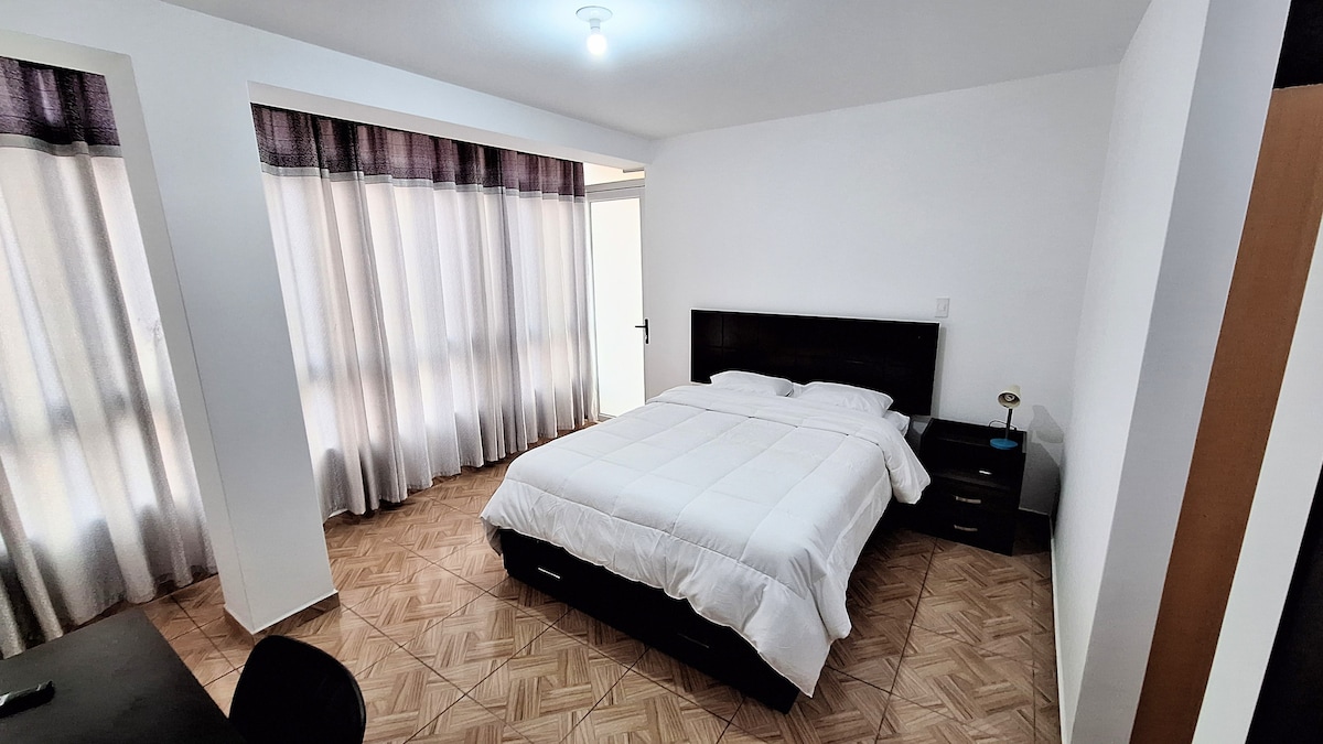 Bienvenidos a nuestro Hermoso, e impecable departamento ! Disfruta de un alojamiento seguro y lujoso, con todo lo que necesitas para pasar unos días extraordinario, al lado de tu pareja o amigos. El departamento ha sido implementado pensando en la comunidad y placer de los huéspedes con equipamiento de excelente calidad. Está ubicado en el 5to piso (no hay ascensor). Disponible lavadora, Está al costado de un minimarket y de lugares cercanos. A 10min del aeropuerto.