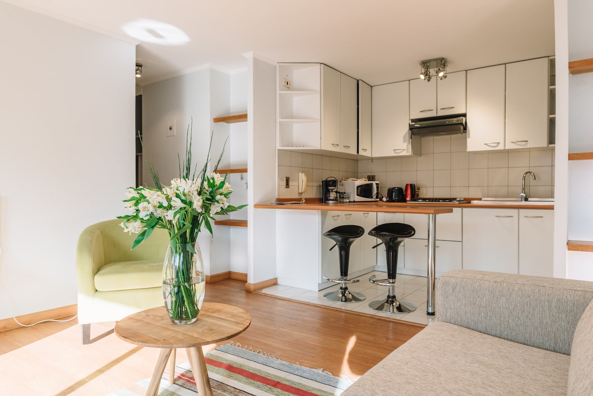 Cómodo Departamento en pleno Providencia, muy luminoso, con todas las comodidades que necesitas. Excelente ubicación a pasos del Metro Los Leones, supermercados, restaurantes y otros servicios. Traslado desde y hacia el aeropuerto Departamento sanitizado y rigurosamente aseado. Cama de dos plazas y en la sala un cómodo sofá cama para un huésped adicional. Cuarto piso sin ascensor, ventilador y aire acondicionado, en invierno calienta camas. Llegada flexible dependiendo de la hora