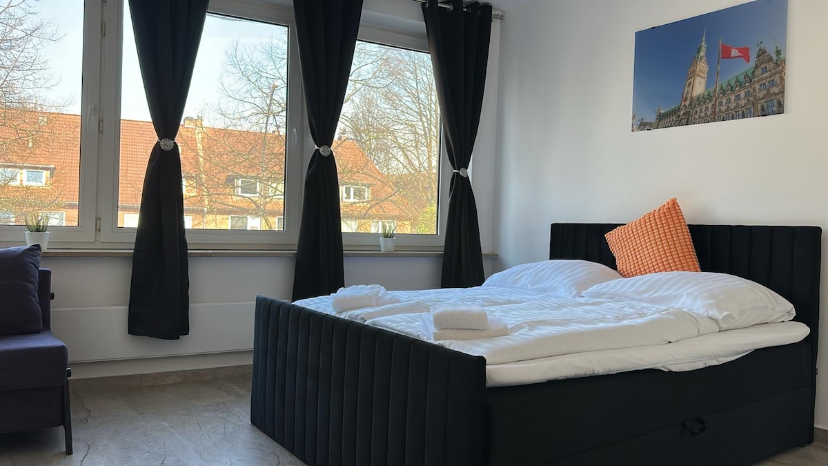 ☆ AHRENSBURQA XOŞ GƏLMİSİNİZ ☆ Yeni təmir edilmiş mənzil 1-2 nəfər üçün mükəmməldir və müasir dizaynı və mərkəzi mövqeyi ilə seçilir. → Qatar stansiyası 3 dəqiqə uzaqlıqda → 24 saat giriş → Sakit mövqe → Açıq mənzərəli rahat iş yeri → 65 düymlük ağıllı televizor → 180 sm x 200 sm ölçülü çarpayı Dondurucu, soba, mikrodalğalı soba ilə→ mətbəx → Qəhvə və çay → Waipu TV: Kabel televiziyası və tələb əsasında 40 000-dən çox film və serial → 100 Mbit ilə yüksək sürətli WLAN Küçədə → parkinq yerləri