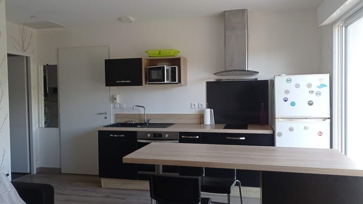 Grand appartement de 65m2 au rez-de-chaussée d'une maison individuelle. Neuf il est entièrement équipé et très spacieux. Vous avez une terrasse privative pour prendre vos repas avec vue sur le mont Ursuya et une place de parking sécurisée. Une grande chambre avec 1 lit de 140 et 2 lits de 80. SDB et WC séparé. Serviettes de toilette, draps housse et housse de couette non fournis sauf en supplément : 50€ pour 2 personnes (grand lit) + 30€/personne supplémentaire. Merci de m'en informer en amont.