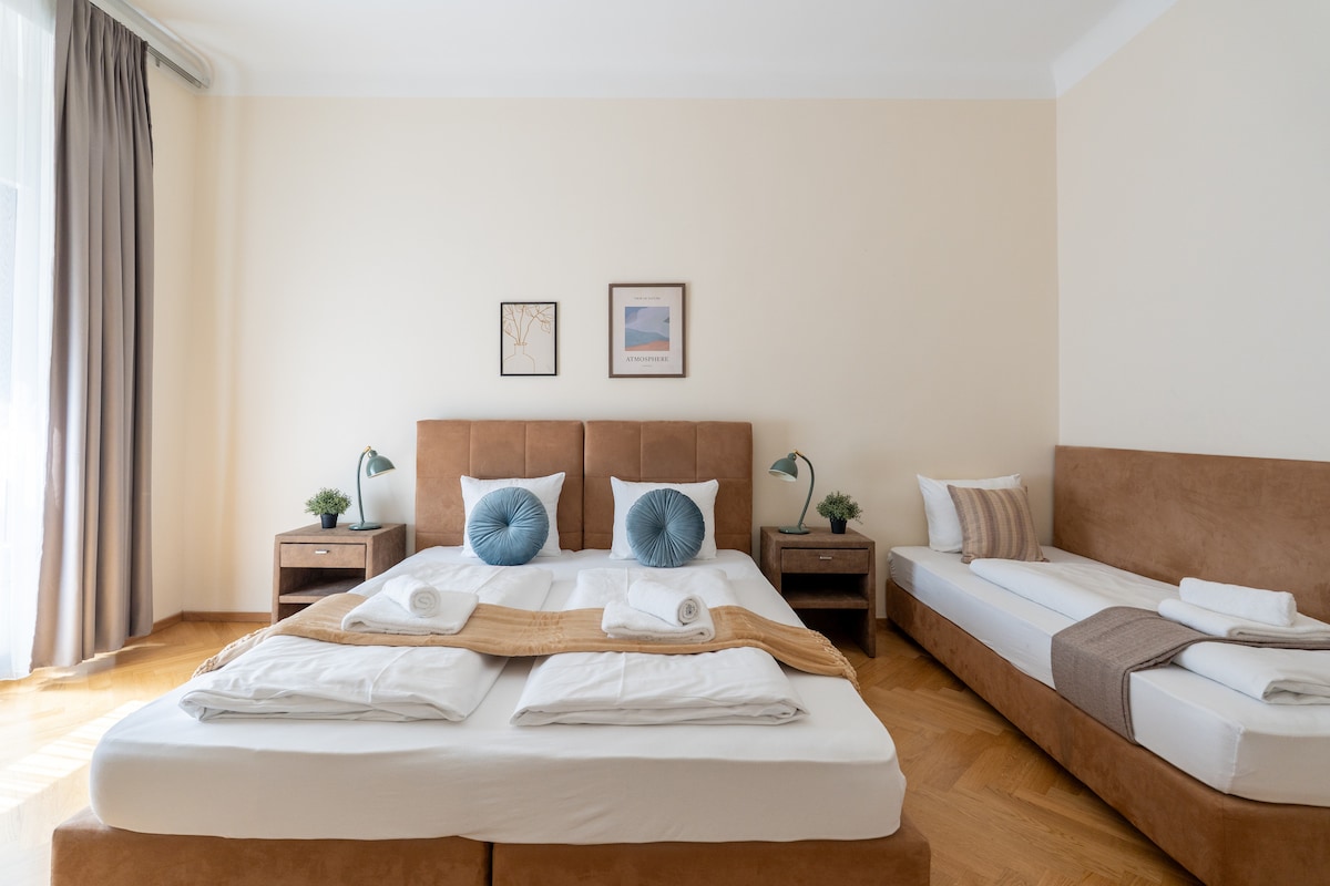 Ştefan meydanına cəmi 12 dəqiqə məsafədə yerləşən bu 100 kvadratmetrlik butik mənzildə lüks rahatlıqdan zövq alın. Əla kafelər və supermarketlərlə canlı bir ərazidə yerləşir Mükəmməl ictimai nəqliyyat: metro U3 və hava limanı xətləri S7/CAT yaxınlıqda. Mənzil təklif edir: • 4 dəbli yataq otağı • uyğunlaşan çarpayılar: ortopedik döşəkləri olan 4 böyük ölçülü və ya 8 tək çarpayı – boşluqsuz birləşdirilmiş böyük ölçülü çarpayılar - mükəmməl rahatlıq. • 3 hamam otağı (2-si bitişik) • qabyuyan maşın/paltaryuyan maşınla tam təchiz olunmuş mətbəx • günəşli terras