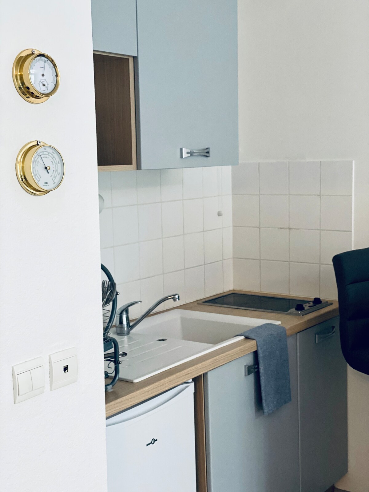 Studiya 18 may ayının ortalarından sentyabrın ortalarına qədər parkinq yeri və açıq üzgüçülük hovuzu olan Honfleurdan 5 dəqiqəlik məsafədə yerləşən turist iqamətgahında yerləşir. 25 m2-lik qonaqlamaya tam təchiz olunmuş mətbəx, 150-179 sm ölçülü çarpayı, divan-çarpayı (uşaq), tualeti və terrası olan hamam otağı daxildir. studiyanın üstündə və altında heç bir mənzil yoxdur. Kiçik otaq sol tərəfi (çarpayı) növbəti mənzildən ayırır. Döşəkağı-dəsmal paketi: 11 avro (yataq + dəsmallar + çay dəsmalı və s...)