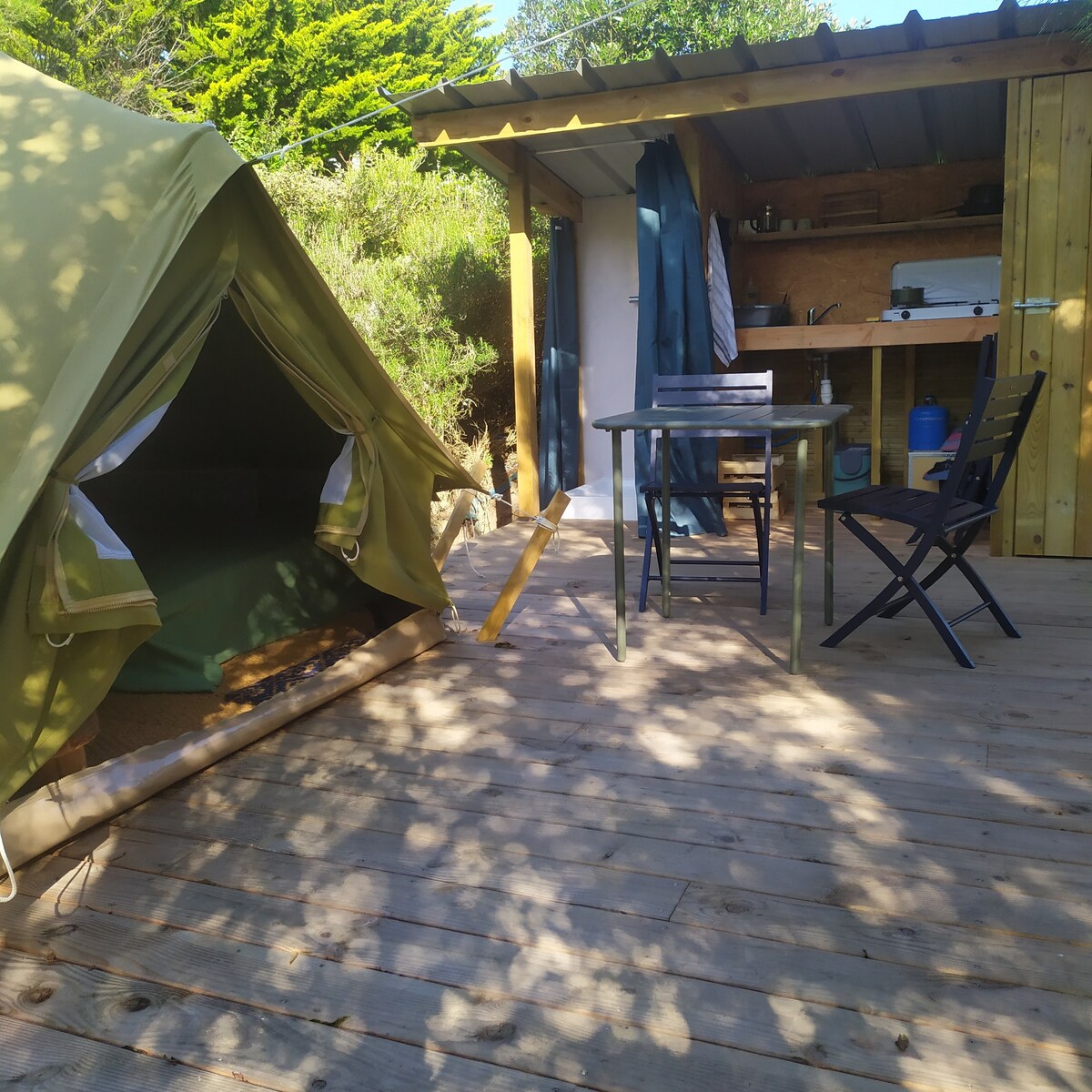 Xoş gəlmişsiniz! Burada muxtarsınız və dincəlmək üçün bu yerin rahat şəraitindən zövq ala bilərsiniz. Sizin ixtiyarınızdadır: açıq havada duş (dəniz mənzərəli), quru tualetlər, qaz şkafları, elektrik çaydanı, kiçik soyuducu, döşəkağılar və döşəkağılar, kitablar, qamak. Axşamlar, gün batımından zövq almaq və sorğu əsasında velosipedlərimizi götürmək üçün çadırın yaxınlığında kiçik bir yanğın yarada bilərsiniz. Dənizdən 5 km məsafədə - meşədən və Lüsern abbatlığından 2 km məsafədə - Qranvildən 10 km, mağazalardan isə 4 km məsafədə yerləşir.