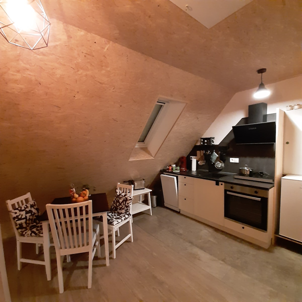 Bu xüsusi və sakit məkanda dincəlin. Çardaq mənzil ikimərtəbəli yaşayış evində yerləşir və sahəsi təxminən 37 m² -dir. Mənzil unikal taxta konstruksiyası, gün işığı vanna otağı, eləcə də tam təchiz olunmuş mətbəxi olan açıq yaşayış/ yemək sahəsi ilə heyran edir. Bundan əlavə, mənzildə 140 x 200 çarpayısı olan yataq otağı var. Bundan əlavə, maksimum 3 nəfərin yerləşməsi üçün 90 x 190 əlavə çarpayı təklif edirik.
