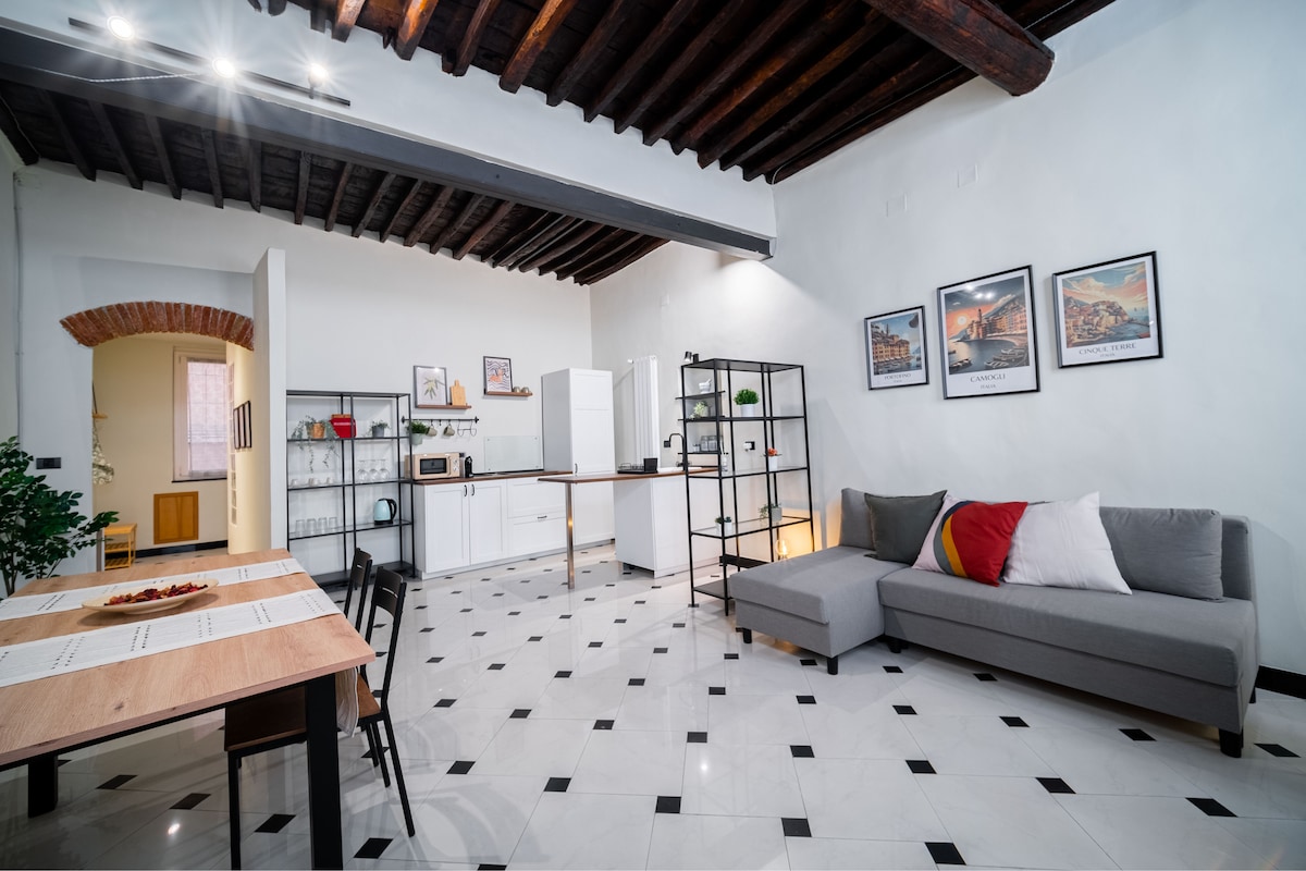 Yeni təmir edilmiş XVII əsrə aid "Arco" da yerləşən studiya, mərkəzi Via XXtembre-dən atılan daş. Əmlak 6 mənzil və 3 parkinq yerindən (mövcudluq şərtilə 20 €/gün) ibarətdir. Sənaye üslubunda mebellə təchiz edilmiş, sahəsi 47 kvadrat metrdir və böyük dolabı, hamam otağı, divan-çarpayı, balaca mətbəxi olan girişdən ibarətdir. Təmin edilən qəhvə. İkiqat şüşəli və qaralma pərdələri yaxşı istirahət, Wi-Fi, paylaşılan paltaryuyan və quruducu təmin edir.