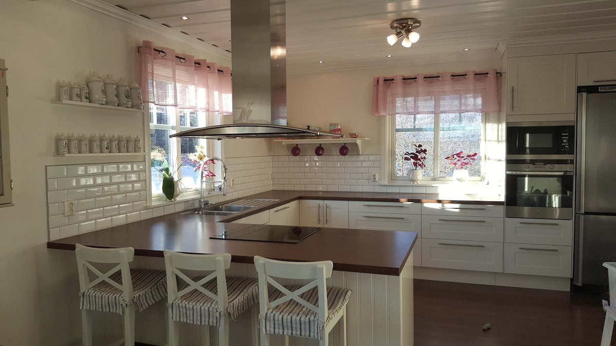 Şəhərdən cəmi 10 dəqiqəlik məsafədə füsunkar villa. Plitəli sobası olan böyük havalı mətbəx və rahat qonaq otağı. Göyərtə böyükdür və evdə tikilmiş divanda yemək vaxtı yeddi nəfərə qədər adam qala bilər. Bir neçə yataq otağı daha böyük ailə üçün yer təmin edir və çöldə uşaqların sevdiyi tramplin var. Yaşıl budaq bağı kifayət qədər kölgə yaradır, həqiqətən isti günlər. Əsl evə xoş gəlmisiniz!