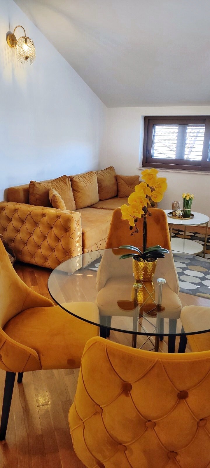 Bu, 34 kvadrat metrlik birinci mərtəbədə mənzildir. O, çox günəşlidir, işıqlarla doludur və qışda çox isti olur. Dağlara baxan bir balkonu var. Əks tərəfdə həyətdə böyük qapı var. Burada hər kəsin özünü rahat hiss etməsi üçün çoxlu sevgi və arzular var. Rəsm məktəbini bitirdiyimə görə bu məkanın təşkilində vizual incəsənət üçün olan sevgimi tətbiq etməyə çalışdım.