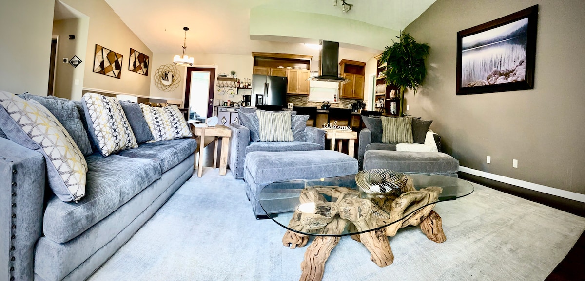Küçənin sonunda sakit bir məhəllədə yerləşən bu gözəl bəzədilmiş, təzə tikilmiş evdə sevdiklərinizlə birlikdə istirahət edin və tətil günlərinizdən zövq alın. Ultra yumşaq və rahat yataq dəsti ilə birlikdə xətt çarpayılarımızın üst hissəsində oyaq dincəldi və təzələndi. Rahat və ayrıca əsas yataq otağında ilk bənövşəyi döşəkli çarpayı, eləcə də əsas hamam otağından arxa verandada nümayiş etdirilən ayrıca çıxış var. Mebellə təchiz edilmiş sakit veranda da dincəlmək üçün mükəmməl bir yerdir.