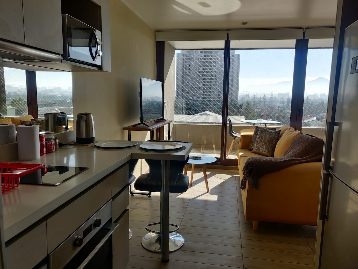 Welcome! • Enjoy easy access to much of Santiago via nearby main avenues. • Rest comfortably on a bed designed for your relaxation. • Parking is included, and you can ask us if you need an extra spot. • Just minutes from Estadio Nacional (Line 6) and Ñuble (Line 5) metro stations. • Close to shopping centers and supermarkets. • Fully equipped kitchen to cook whatever you’re in the mood for. • Security cameras in the building for your peace of mind. • Modern 34m² apartment.