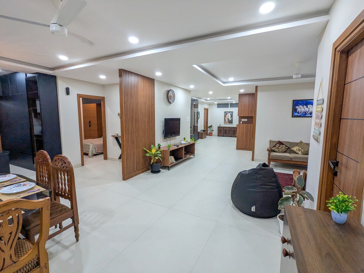 Qısa və ya uzunmüddətli qonaqlamalar üçün ideal olan 3 otaqlı dəbdəbəli mənzilimizə xoş gəlmişsiniz. Bitişik hamamları olan 3 kondisionerli yataq otağından, 43 düymlük Smart TV, yüksək sürətli Wi-Fi və qapalı yelləncəkli rahat qonaq otağından zövq alın. Tam təchiz olunmuş mətbəxdə qaz sobası, mikrodalğalı soba, RO təmizləyici, soyuducu və qab-qacaq var. Hitech City Metro, Usha Malpuri's Kitchen (100 m), ABŞ Viza Mərkəzi (1 km), Kabel Körpüsü və əsas İT mərkəzlərinin yaxınlığında rahat yerləşir.