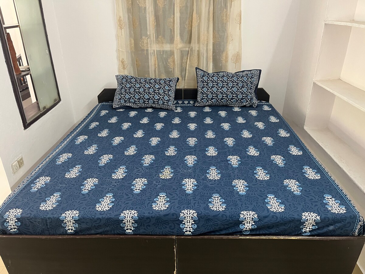 Two room's kitchen Studio Separate Portion (1st floor stairs access),which will have its independent entrance. Details AC Bed Room : Queen size bed (6” soft mattress ) with attached toilet Living Room : Heritage Bed 4X6 size with mattress For extra guest Futon ( safa cum bed) Amenitie High speed Fiber optical broadband WiFi Dedicated workspace including Heritage wooden writing desk with chair Kitchen with elect induction, water purifier, air fryer and essential kitchen utilities