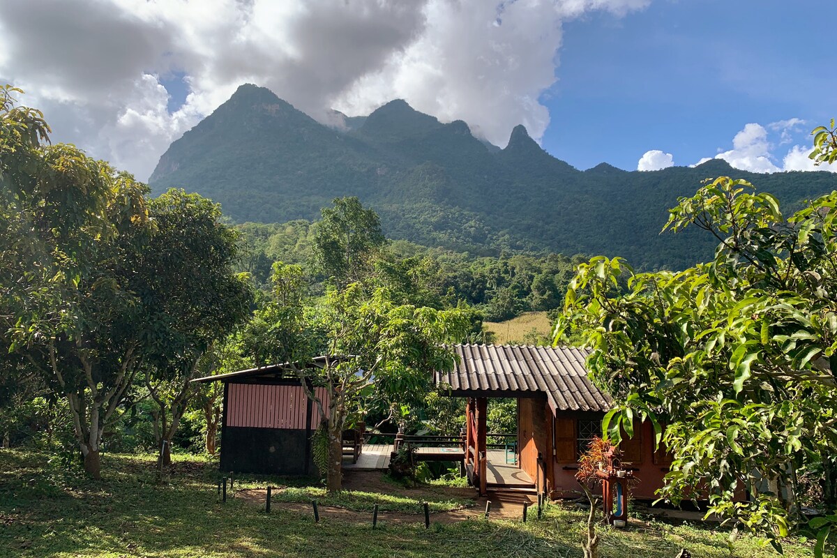 🌿 Meyvə ağacları ilə əhatə olunmuş ikimərtəbəli kiçik taxta kabinə. İncəsənət studiyamızın yanında yerləşən birinci mərtəbədəki mətbəx yemək bişirmək üçün bir məkan təmin edir. Pilləkənlərlə yuxarı qalxmaq açıq balkonla təbii əlaqəni göstərir. Küləyə açılan yataq otağı ilə bütün günü meşə qucağına yaxın qalın. Hava sərin olanda tonqal ətrafında otururuq, ürəyimiz isti olsun. Əbədi ulduzları dinləyin, MotherNature (Pachamama) və Doi Luang ChiangDao-dan gələn enerjiyə Mübarək