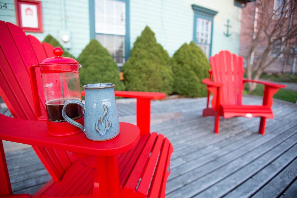 Location, location, location! This studio apartment is located in the heart of Mahone Bay. Restaurants, shops, grocery store, pharmacy, and of course the three churches are within a 5 minute walk. The space is colourful and cheery with an east coast vibe. The apartment has a well equipped kitchenette if you prefer to cook light meals yourself. There is also a dining area which could be used as a very comfortable work space. Enjoy our beautiful town!