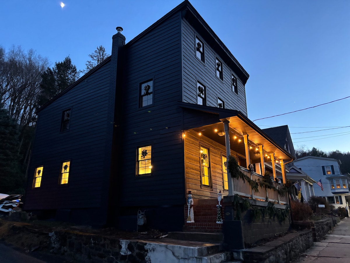 This historic Victorian home was built in 1870 and offers early American charm and furnishings, has wide plank floors, modern kitchen and modern bathroom. This house is located on the main drag of Jim Thorpe and has parking for one car. The home has a king size bed in the master bedroom and a queen size bed in the second bedroom. There is cast iron gas wood stove, basic cable TV, WIFI, new kitchen, and bathroom. There is a shaded private courtyard, upper deck and a Mountainside Gazebo.