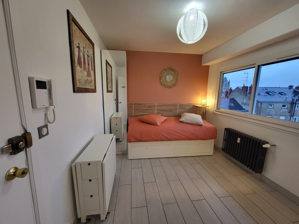 Liftli iqamətgahın 5-ci və sonuncu mərtəbəsində, Boulevard Foch küncündə və UCO və SNCF Station-dan 2 addım məsafədə, panoramik mənzərəli əsas otaqdan (Katedral, Tur Saint Aubin, Église Saint Joseph, Maison Bleue) ibarət, vitro plitəsi olan balaca mətbəx, soyuducu, mikrodalğalı soba, uzadıla bilən masa, uzadıla bilən masa, uzadıla bilən çarpayı (80 x190, 160 x 190 cms) daxil olmaqla vizasız yaşayış yerinin 5-ci və sonuncu mərtəbəsində. Hamam otağı/Tualet. Binanın ətəyində mağazalar və nəqliyyat.