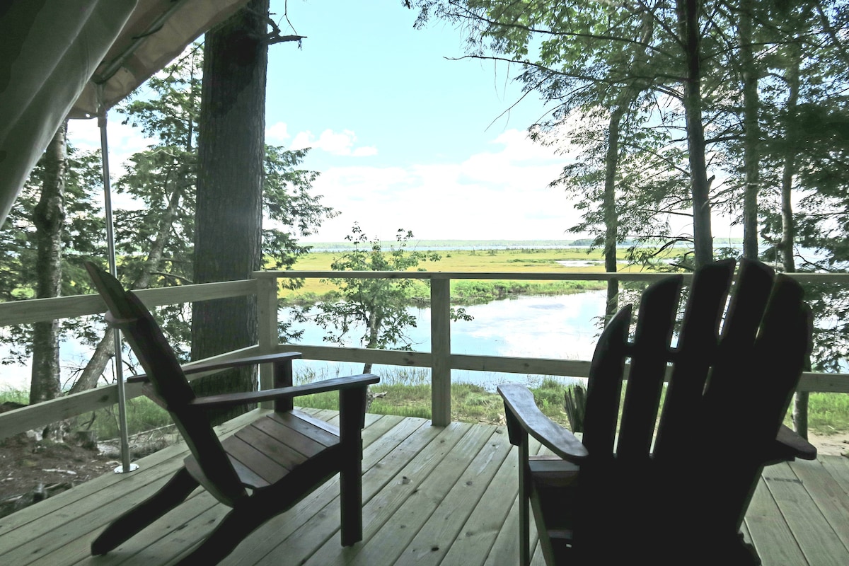 "Ən yaxşı çadır". Qranit qayaların arasında yerləşən sahilyanı küknar meşəsindəki sükunət və gözəlliyin dadını çıxarın. Əsas evdən uzaqda olmayan geniş platformada böyük çarpayısı olan çadırınız yerləşir. Göyərtədəki Adirondak stullarında dincəlin və sahildən bir qədər kənarda yerləşən Mark Adasının sis siqnalını dinləyin. Çadır divarları, yellənən şamlar, alovların işığı və çox rahat bir çarpayı sizi gözləyir. Dir-Ayl körpü ilə birləşdirilmiş bir adadır.