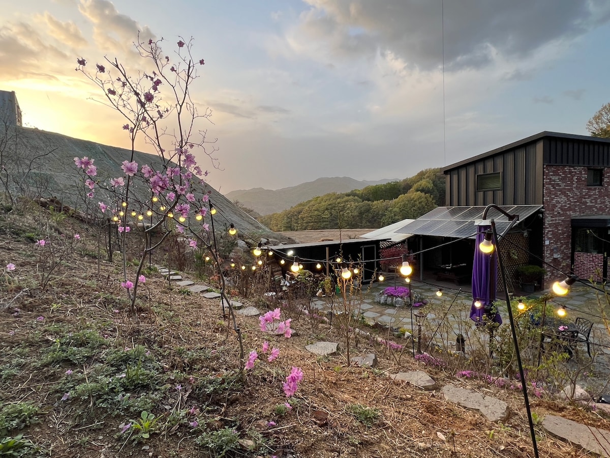 Evimiz kəndin yuxarı hissəsində yerləşir, odur ki, qonaqlamanız zamanı kənardan baxışlardan və ya səs-küydən azad olacaqsınız. Çöldə böyük bir bağ (300 pyeonq + 990 pyeonq ekoloji ofisin bağında) var, buna görə də uşaqlar bunu sevirlər və ikinci mərtəbədəki pəncərədən Namhan çayının mənzərəsi və birinci mərtəbədəki hər məkanın mənzərəsi müxtəlif və gözəldir, buna görə də böyüklər bunu üstün tuturlar. Həmçinin evdən 100 metr məsafədə yalnız kəndə aid gəzinti cığırı (Qaegunsan) var, buna görə də yüngül trekking üçün yaxşıdır (1 saatlıq gediş-gəliş).