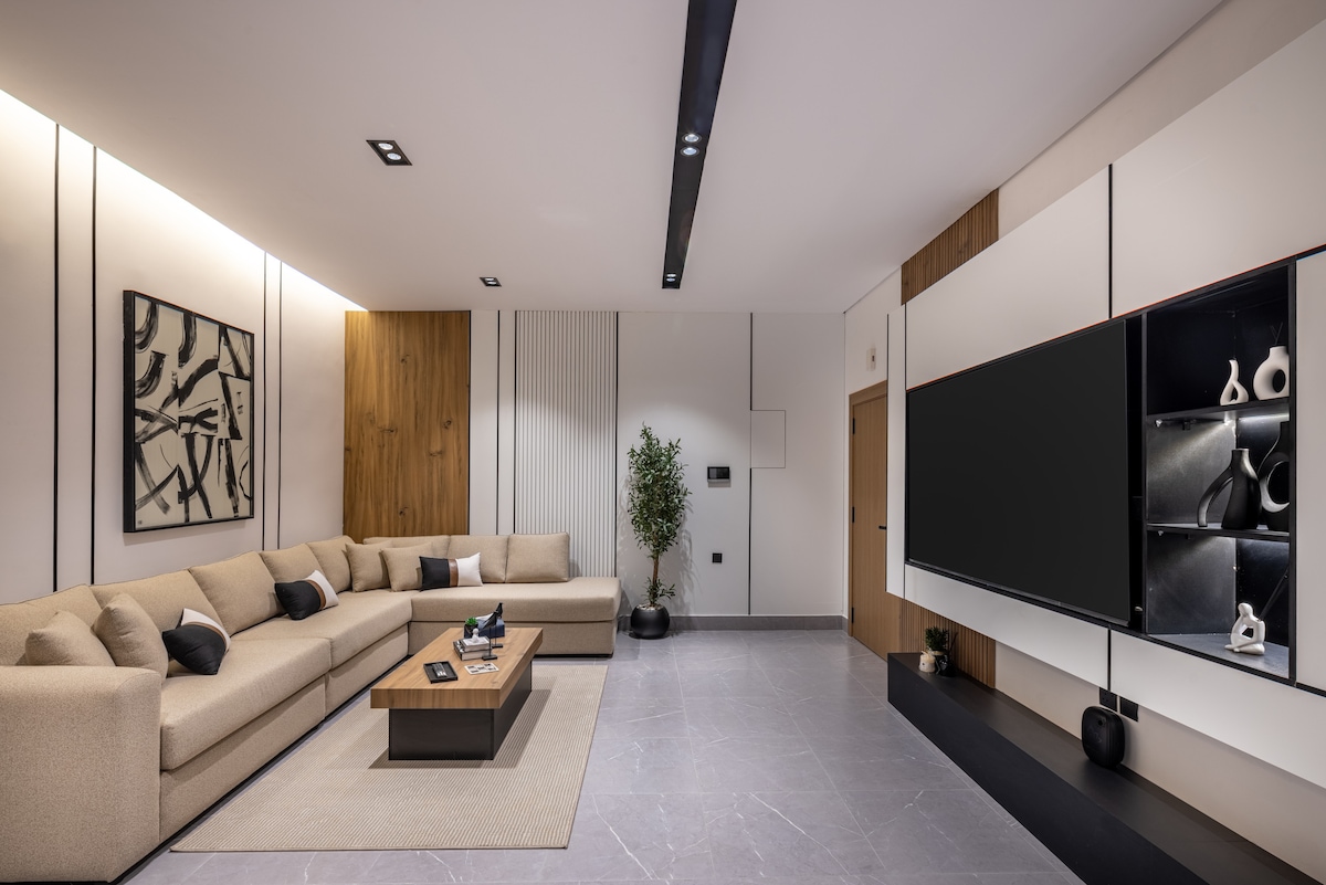 İki yataq otağı və 75 düymlük ekranı olan müasir qonaq otağı
