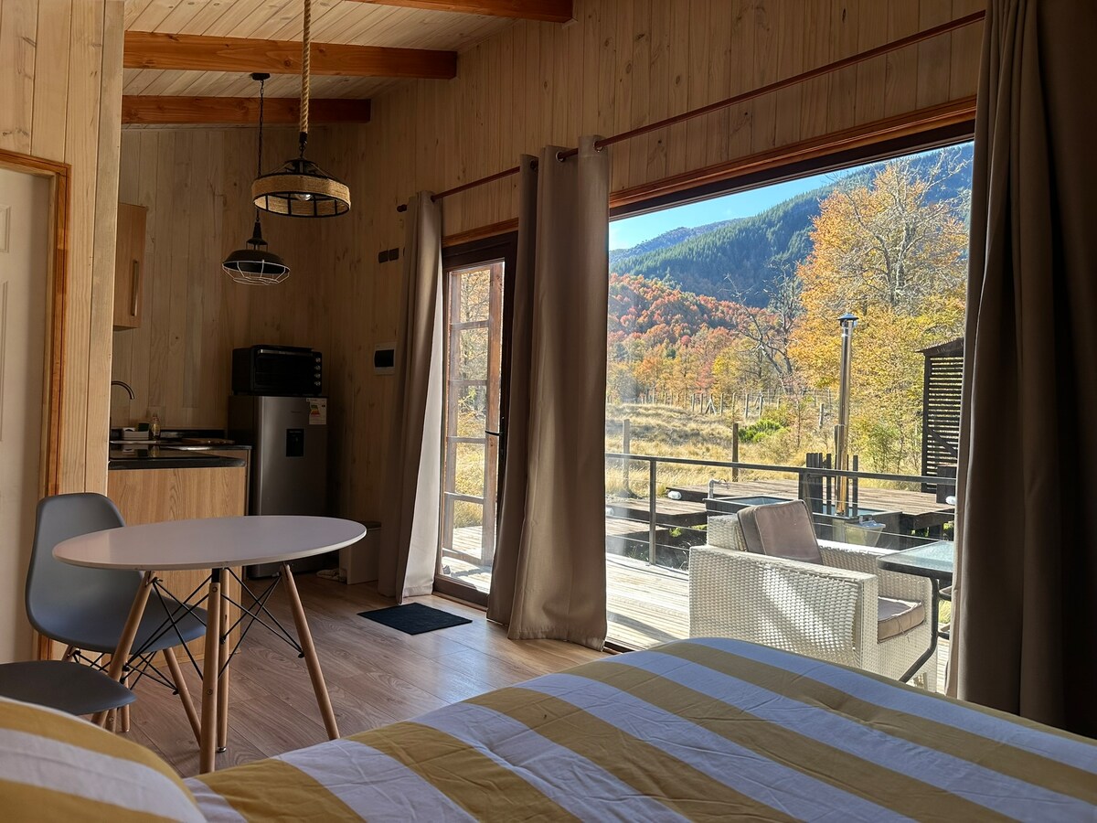 Nuestra cabaña estudio (un ambiente) tiene una vista espectacular, es para 3 personas máximo 4 cuando hay niños. Cuenta con una tina caliente en una terraza junto al río. Esta ubicada al borde del río Cautín e inmersa en un hermoso parque con senderos, sauna, quincho junto al río, bancas para pescar, playa de arena, todo en una hermosa parcela con 200 mts de borde de río. Relájate mirando el río en nuestro sauna, de uso exclusivo de nuestros huespedes. Estamos a 8 kms del centro de ski Corralco.