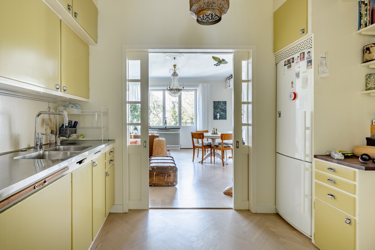 This three room apartment is only three stops from the Central station and on walking distance to a lot of nightlife, still situated on a quiet dead end road facing a green park. It has two small west facing balconys and lies on the 4th floor. There is one double bed, one singel bed, an thick extra mattress, a sofa that can be made up for a comfortabel singel bed and a cot for a baby if needed . Wireless internet, bed linen, towels and a first breakfast is included. Welcome!