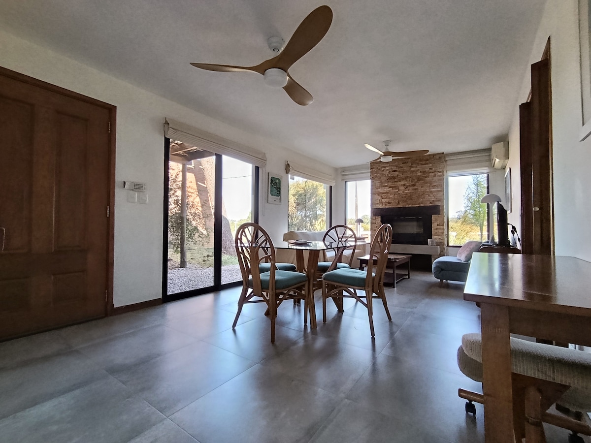 Casa Serrana. Living comedor con estufa de alto rendimiento, cocina equipada, dormitorio al frente con vista al jardín y dormitorio principal en suite con vista al fondo. 2do baño completo. Predio cercado y arbolado. Las ventanas son de aluminio, con cortinas de enrollar y mosquiteros. Parrillero y cochera techados. Servicios: AA en dormitorios y living, ventilador en dormitorios, TV con chromecast, WiFi, Direct TV, parlante bluetooth, alarma y lavarropas. No incluye consumos de luz y agua.