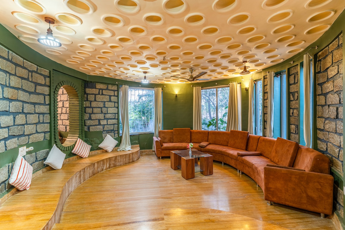 Get away from it all! Just 60 kms from Bangalore. Nestled among Mango, Neem, Areca and many flowering trees is this Mud and Boulder house with pool. The land is in 5 levels and has multiple views. Owned by an Analyst and an Architect couple, care has been taken to create a free flow rustic design. From sunrise to sunset one can hear the sunbirds, babblers, parrots; see Kingfishers and expect morning visits by peacocks.