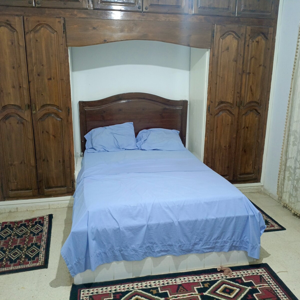 Geniş və kondisionerli evimizdə sizə ev sahibliyi etməkdən məmnunuq. Mənzildə 3 nəfər yerləşə bilər. Yaşayış yerinin ətəyində mağazalar və qəhvə. Cütlüklər, dostlar və ailə ilə paylaşmaq üçün əsl Tunis təcrübəsi yaşayın. Tunisdən 20 dəqiqəlik məsafədə geniş və rahat qonaqlama yerində olmaq istəyirsinizsə, indi bron edin. Yaşayış yerinin qarşısında pulsuz parkinq, tez-tez taksi keçidi. Medinaya 10 dəq məsafədə qatar stansiyası.