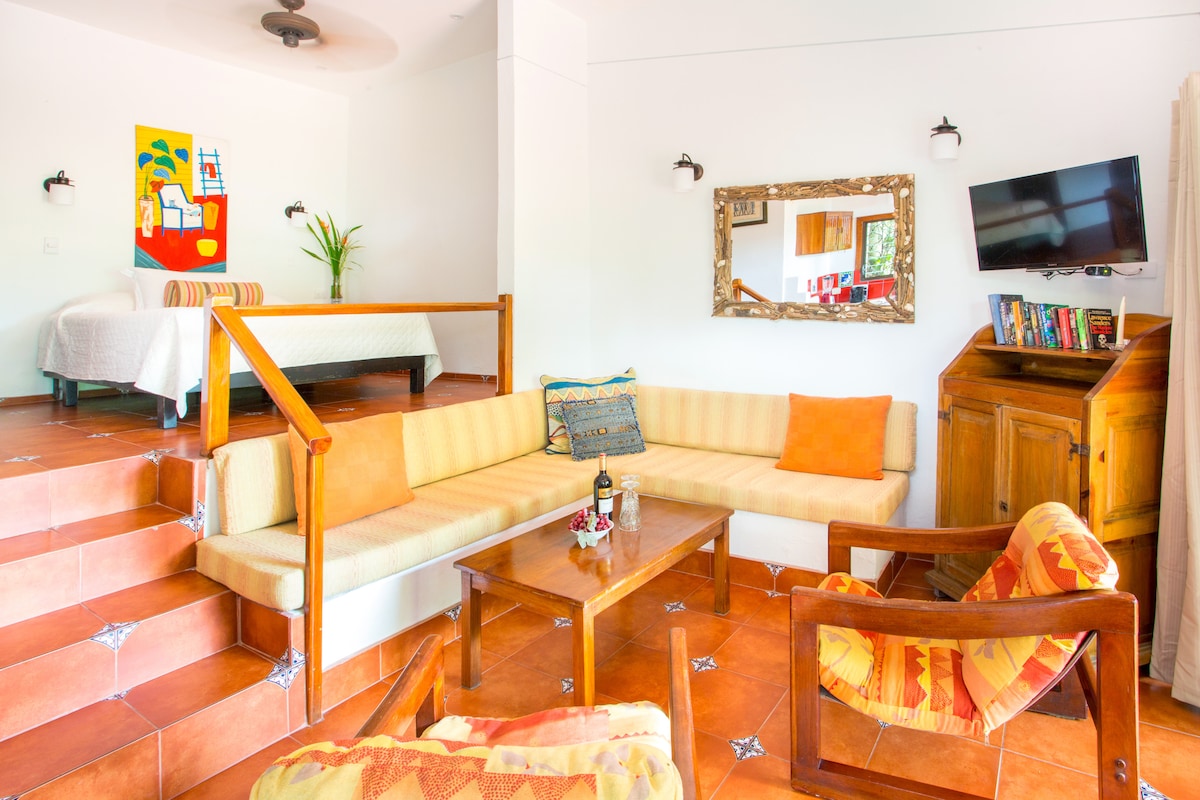 Manuel Antonio mövqeyində valehedici tam təchizatlı kondominium! İki 150-179 sm-lik çarpayı, A/C və tavan ventilyatorları rahat qonaqlamanı təmin edir. Qranit-teak şkaflarından, müasir cihazlardan və kabel televiziyasından zövq alın. Yüksək sürətli Wi-Fi sizi əlaqələndirir. 6 nəfərlik masa, qamak və sallanan stulları olan açıq havadakı eyvanda dincəlin. Sərinləşdirici hovuza dalın. Çimərliklərə, restoranlara və mağazalara yaxındır. Meymunlar tez-tez ziyarət edir! Unudulmaz qonaqlama üçün mükəmməldir!