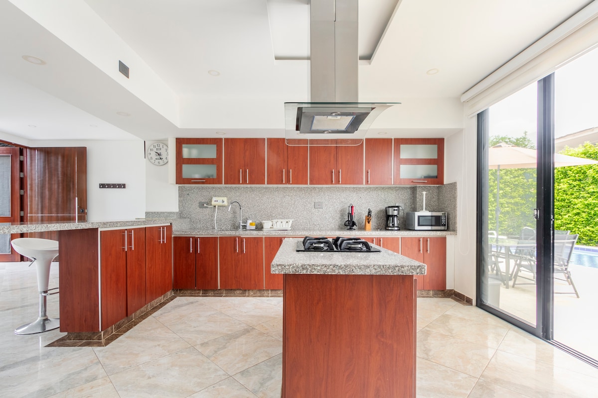 Modern and spacious country house just 5 minutes away from Girardot. Enjoy the wonderful, sunny weather in a private house that includes: AC and private bathrooms in every room; private pool, jacuzzi and Turkish bath; kitchen with all appliances; BBQ area that operates on wood, gas and carbon; inner and outer dining tables; washing machine; social areas ideal for large groups, with Smart TV and AC; gym.