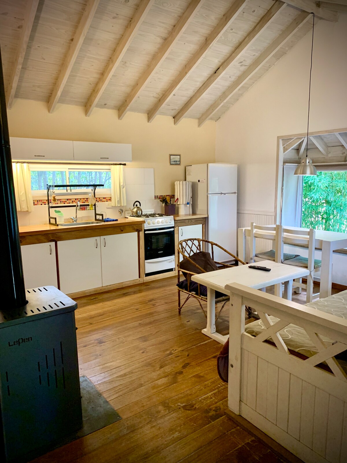 Confort en un entorno tranquilo para 4 PAX (consultá por pasajeros extra) Nuestras cabañas se encuentran ubicadas en el medio del bosque con un parque propio de 900m2. Acceso a solo 7 cuadras del centro comercial y su increíble polo gastronómico, y de playa "Las Acacias" una enorme extensión de arena para perderse entre los médanos. Nuestras cabañas son Pet Friendly (hasta 10kg) Consultá el costo extra. Relajación y diversión, con servicios y comodidad para toda la familia. Te esperamos!