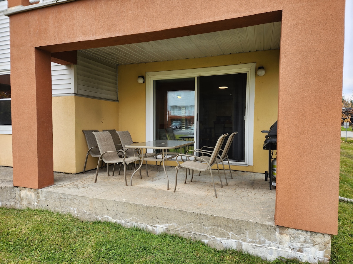 Spacious 1-bedroom ground floor condo unit. Open air concept gives access to a spacious living and dining room area. Very large bedroom with king size bed and plenty of closet space. Living room includes a king size sofa bed to accommodate sleeping arrangements and a wood fireplace to warm up your winter evenings. Fully functional and equipped kitchen includes all needed amenities. Access via the patio door to a large and secluded rear terrace which includes a BBQ for your convenience.
