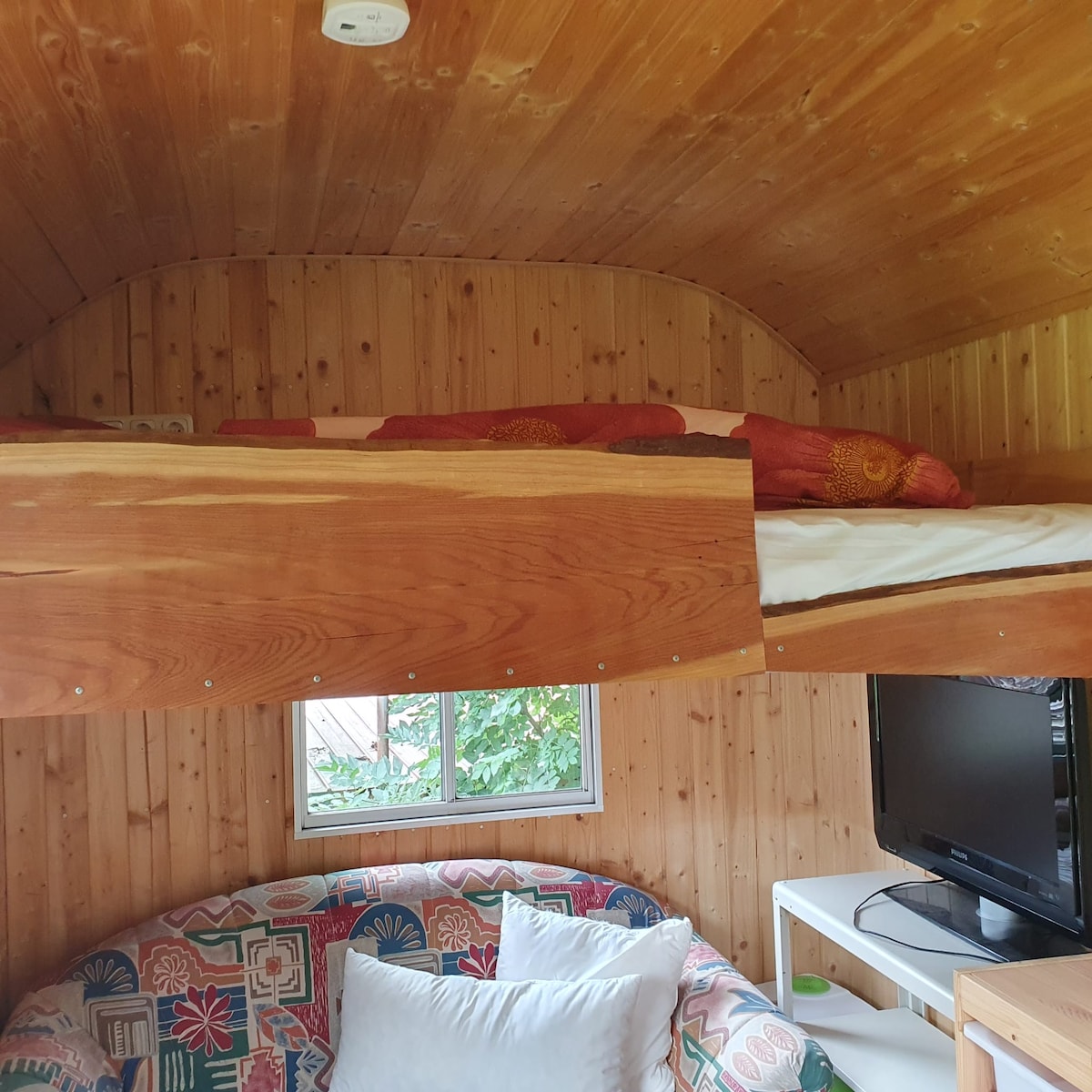 Unser ganzer Stolz ist unser einmaliges Hobbithaus, welches eine ganz besondere Atmosphäre bietet. Hier könnt Ihr eingehüllt in Mutter Erde völlig entspannen, die Seele in der Hängematte baumeln lassen, den Pfauen und Häschen zuschauen, wenn sie am Fenster vorbei ziehen, den Vögeln des Waldes zuhören, ein heißes Bad nehmen oder einfach nur das Leben genießen! Man kann sich selbst verpflegen. Es ist ein Doppelbett und zwei Einzelbetten vorhanden.