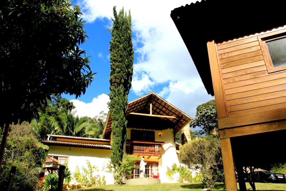 O Chalé do Vale təbiətlə əhatə olunub və bu, dağların xoş iqlimini və sakitliyini axtaranlar üçün ideal tətildir. Məkanımızda ətrafa ən yaxşı mənzərə, 2 yataq otağı, otlu sahə, sarmaşıq, odun sobası, sauna və gözəl bağ var. Alfredo Çaves Atlantik Meşəsinin ortasında qapalı icmada yerləşən taxta dağ evimiz çox rahatdır və heyranedici unudulmaz mənzərəyə malikdir!