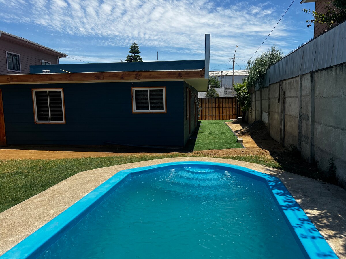 Olmué Meydanının, supermarketlərin, klubların və restoranların pillələri olan bu çox mərkəzi qonaqlama yerində qonaqladığınız zaman ailəniz hər şeyə yaxın olacaq. 5 nəfərlik ayrıca hovuz və çox sakit mühit. Burada 2 nəfərlik çarpayısı olan 1 əsas yataq otağı, 1 1/2 plaza çarpayısı olan 3 nəfərlik ikinci dərəcəli yataq otağı var. Asados və iki hamam otağı üçün quincho. Hamam kabinənin ikinci mərtəbəsində yerləşir. Digər hamam otağı çöldə, hovuzun yanındadır.