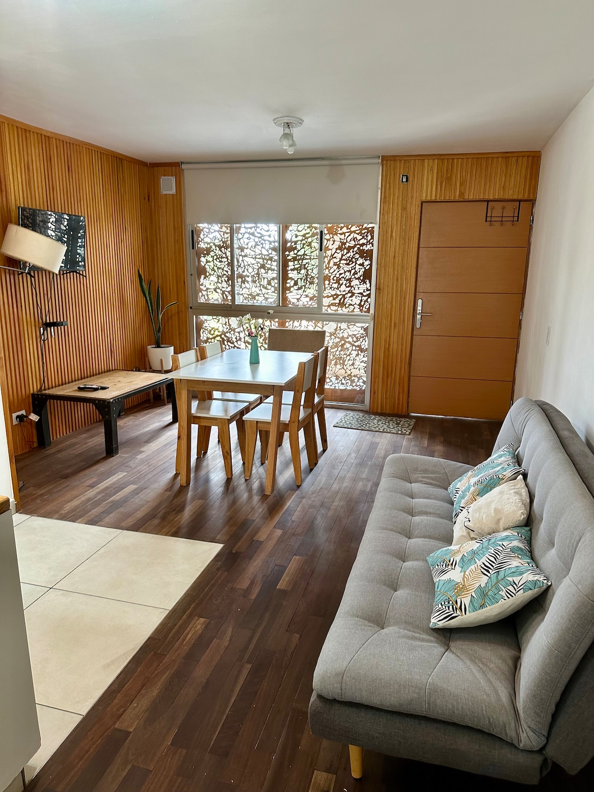 Hermoso departamento con equipamiento a full, dormitorio amplio con cama queen, patio con parrilla y mesa de jardín ,cocina con todo lo necesario y espacio como para realizar home office con conectividad wifi, el baño es amplio cómodo con detalles delicados. Cuenta con la posibilidad de guardar el vehículo dentro de la propiedad en una cochera descubierta compartida. La propiedad esta ubicada cerca de la base aérea de MORON