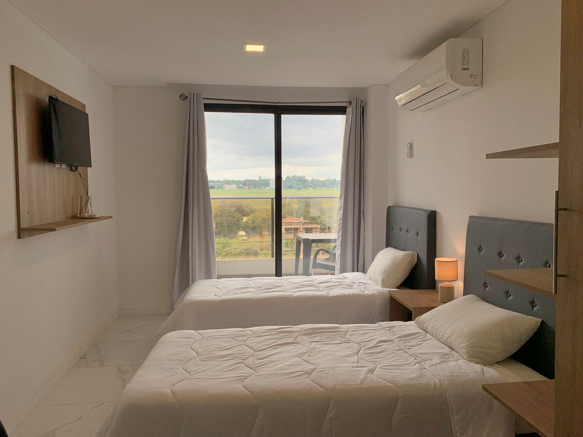 Kick back and relax in this surprisingly roomy studio apartment just outside Asuncion. We have everything for long or short stays. Kitchen is small but fully equipped with fridge, freezer, microwave with grill features, and washer/dryer combo. The complex is near the airport and has ALL THE AMENITIES: padel, tennis, basketball, mini soccer, gym, pool, bar, event space, BBQ, billiards, market, 24/7 security, etc ATTENTION: PARKING SPACE IS NOT INCLUDED, BUT IS AVAILABLE AT AN EXTRA COST.