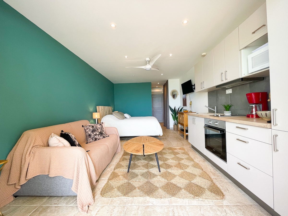 Large, high-quality studio, spacious and bright, confort plus with private bathroom. • Tastefully decorated, cozy and tropical decor • Cleanliness guaranteed • Swimming pool • Air conditioning • King-size bed • WiFi & TV • Equipped kitchen • Ground floor with garden and covered terrace • Prime location in a quiet and leafy residence, ideally situated. Close to the marina, city center, shops, restaurants, ferry terminal, promenade, and more.