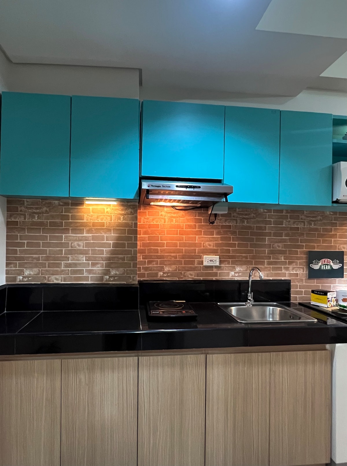 Simple, industrial style, clean and comfy. 29 sqm. unit with 1 bedroom and 1 toilet. FREE Wifi. Best for 2 adults and 2 kids. Living Area has sofa bed and Netflix ready TV. Bedroom has double size bed and Netflix ready TV and office desk and chairs for WFH set up. Kitchen has 4 cu ft fridge, microwave, electric kettle, rice cooker, induction cooker, bread toaster and FREE drinking water. Toilet and Bath has hot and cold shower. We provide towels, basic hygiene kit and hair dryer.