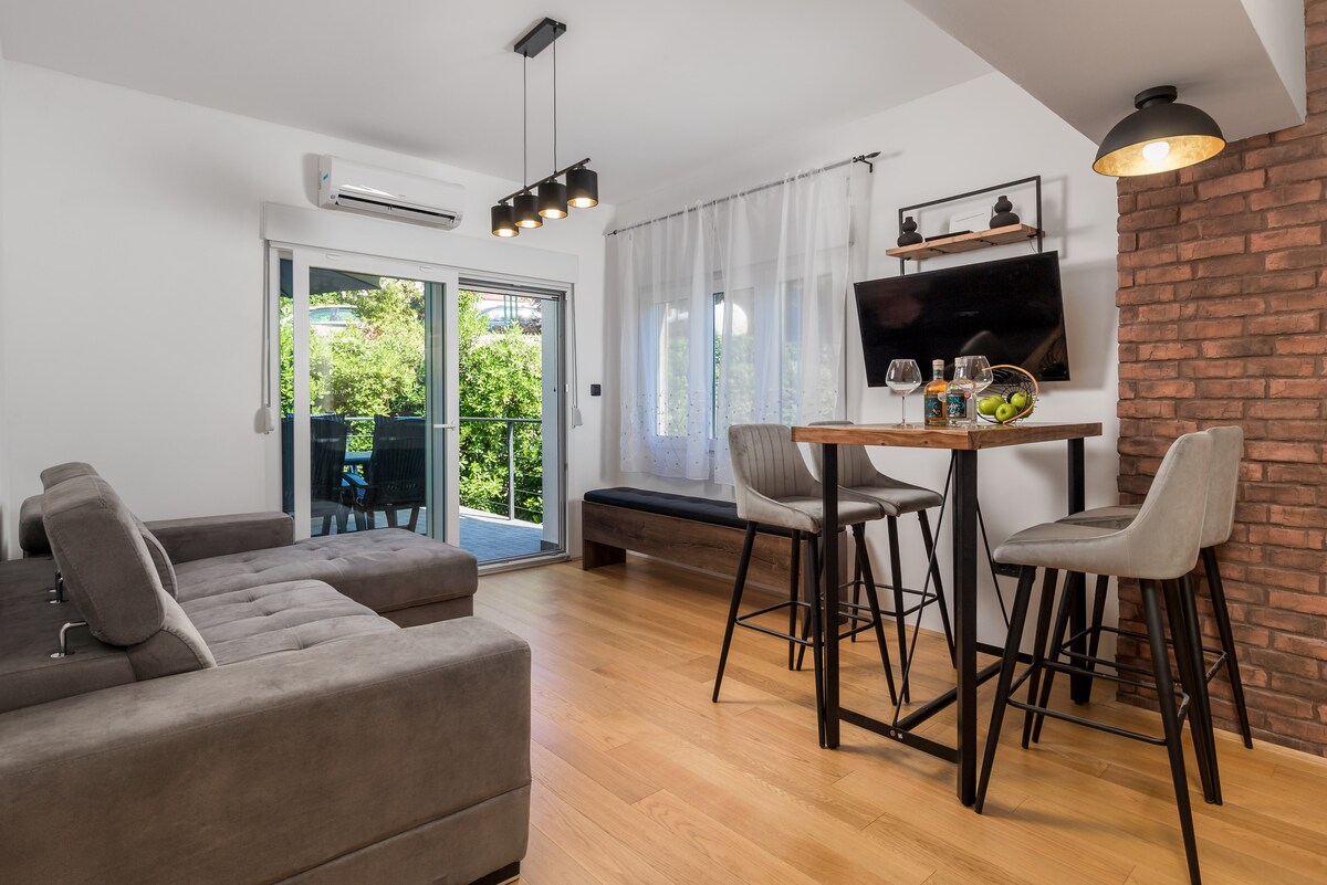 İki böyük üçün mükəmməl olan heyrətamiz mənzərəsi olan müasir mənzil. Bir tərəfdən körfəzə baxan balkondan heyrətamiz mənzərəsi olan gözəl mənzil, digər tərəfdən isə yamyaşıl İstrian florası. Manikürlü parklar və botanika bağları vasitəsilə şəhər mərkəzinə və çimərliklərə gedin. Binanın ətrafındakı bağlarda yaşayan quşların səsinə oyanın, öz palma ağacınızla bağdan sizə baxaraq, balkondan qüruba baxan sakit axşamlardan zövq alın.