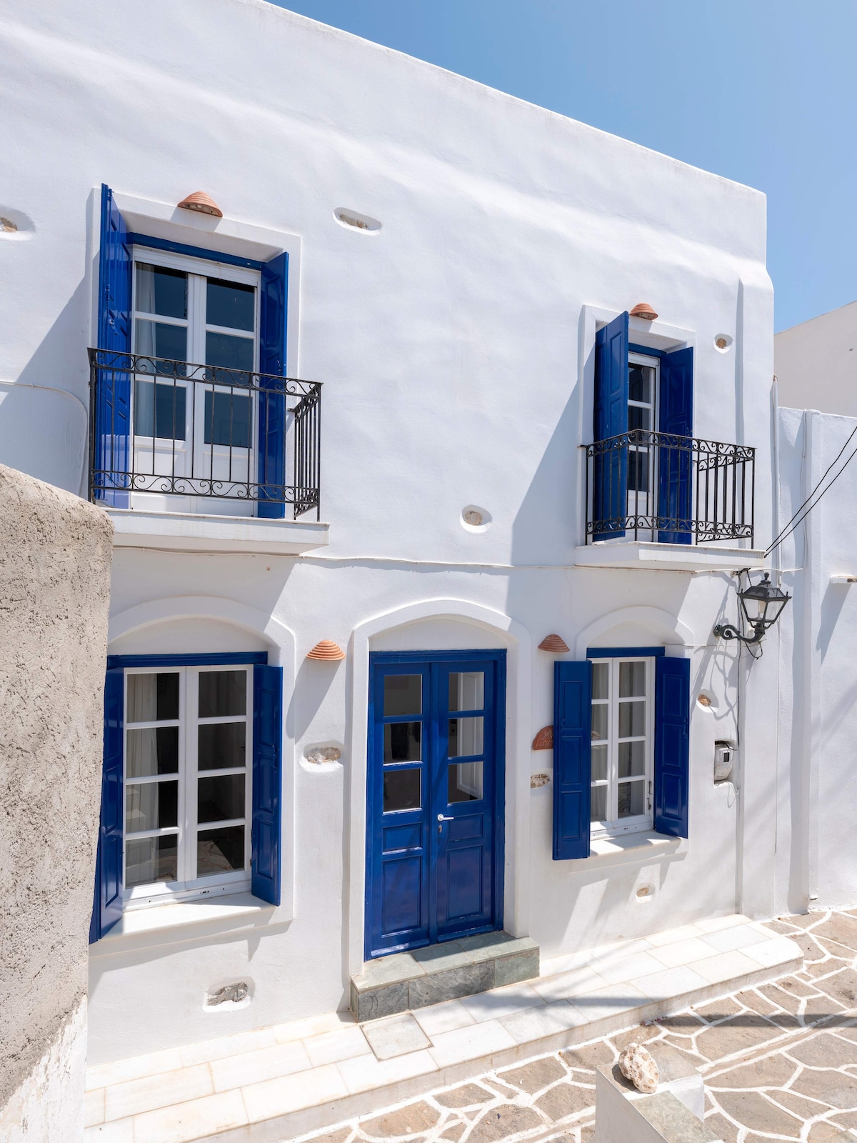 A traditionally renovated, neoclassical building, situated in a traditional square in the Cycladic village of Marpissa. Enjoy your holiday living in a quiet neighborhood, wander around whitewashed alleys, visit traditional tavernas, and folklore museums. Conveniently located in the center of the village and within walking distance from the market street and the crystal clear water beaches of Piso Livadi and Logaras.