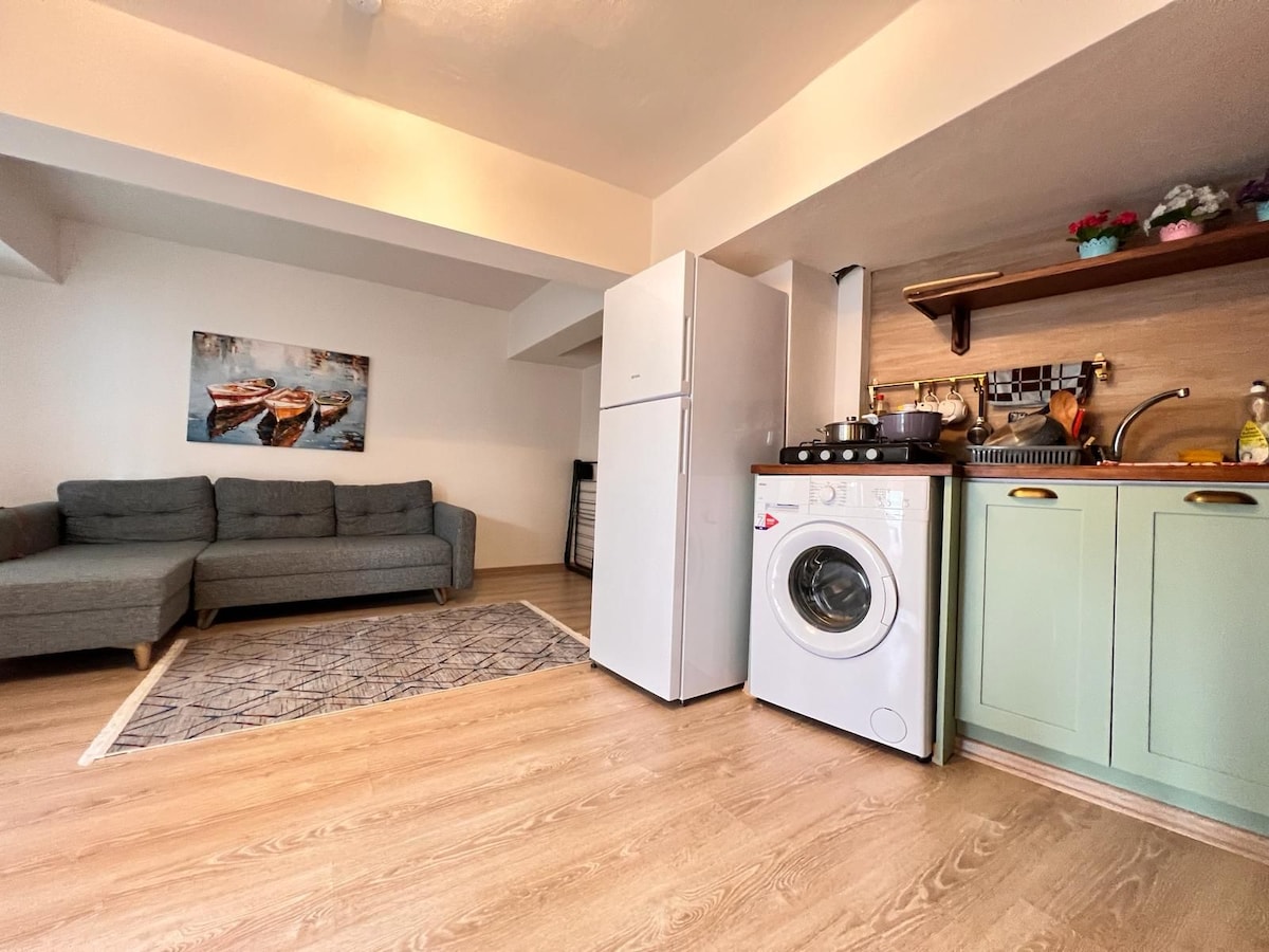 2 otaq, 1 qonaq otağı, mətbəx, hamam otağı və yaşıllıq arasında 1 terraslı bağça. 2 otaq 1 qonaq otağı. Qonaq otağında 2 ikinəfərlik çarpayı və digər 3 divan var. Mətbəxdə qabyuyan maşın, paltaryuyan maşın, soba, soba və soyuducu var. Böyük ekranlı televizor və Wi-Fi. Hər otaqda yeni kondisionerlər, duş və tualetli hamam otağı, terras divan dəsti, masa və stul