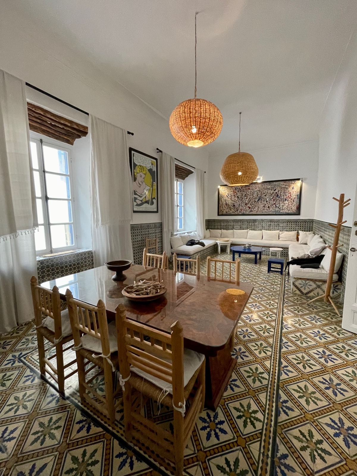 Situé à l'entrée sud de la Médina, dans une ruelle calme, à 50 m du Port d'Essaouira et de sa plage, cet appartement de style loft conviendra idéalement aux amateurs de charme:hauts plafonds anciens en bois, carrelages à l'ancienne, salle de bains en tadelakt, décoration élégante Les pièces sont organisées autour d'un lumineux patio en baies vitrées Vous pourrez également jouir d'une terrasse privative, orientée sud/ouest, de plus de 60m2 avec une vue mer et une vue sur l'horloge de la Médina.