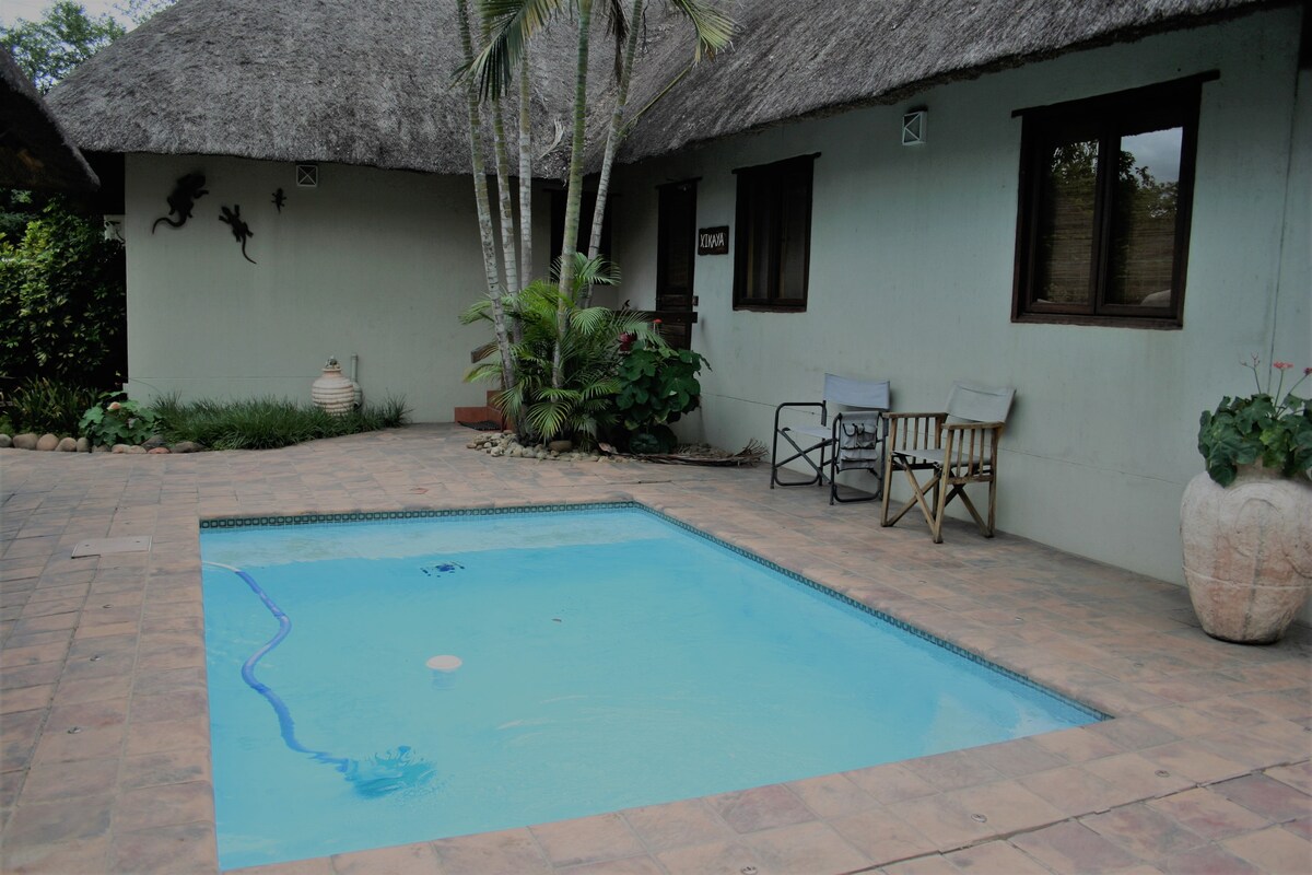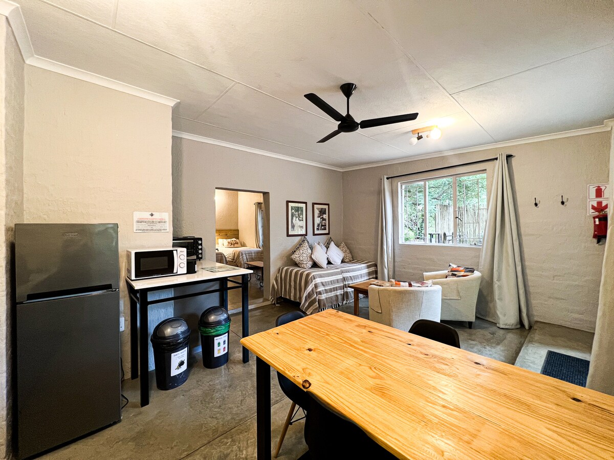 This self-contained chalet has 2 x single beds as well as an additional single bed in the lounge area. It is equipped with an air conditioner, Wi-Fi, Kitchenette, BBQ, lounge, and patio. Partially LOADSHEDDING FREE!