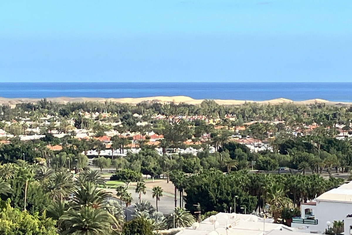 Spacious top-floor apartment on the 8th floor with extra light, privacy and open views – ideal for up to 3 guests. Perfect for longer stays, remote work or relaxed holidays in Maspalomas. Two single beds (convertible to double), sofa bed and workspace. Fully equipped kitchen, Smart TV, Netflix, fast WiFi. Washing machine included. Quiet yet well connected, just a short walk from Yumbo Centre, restaurants, supermarkets and transport.