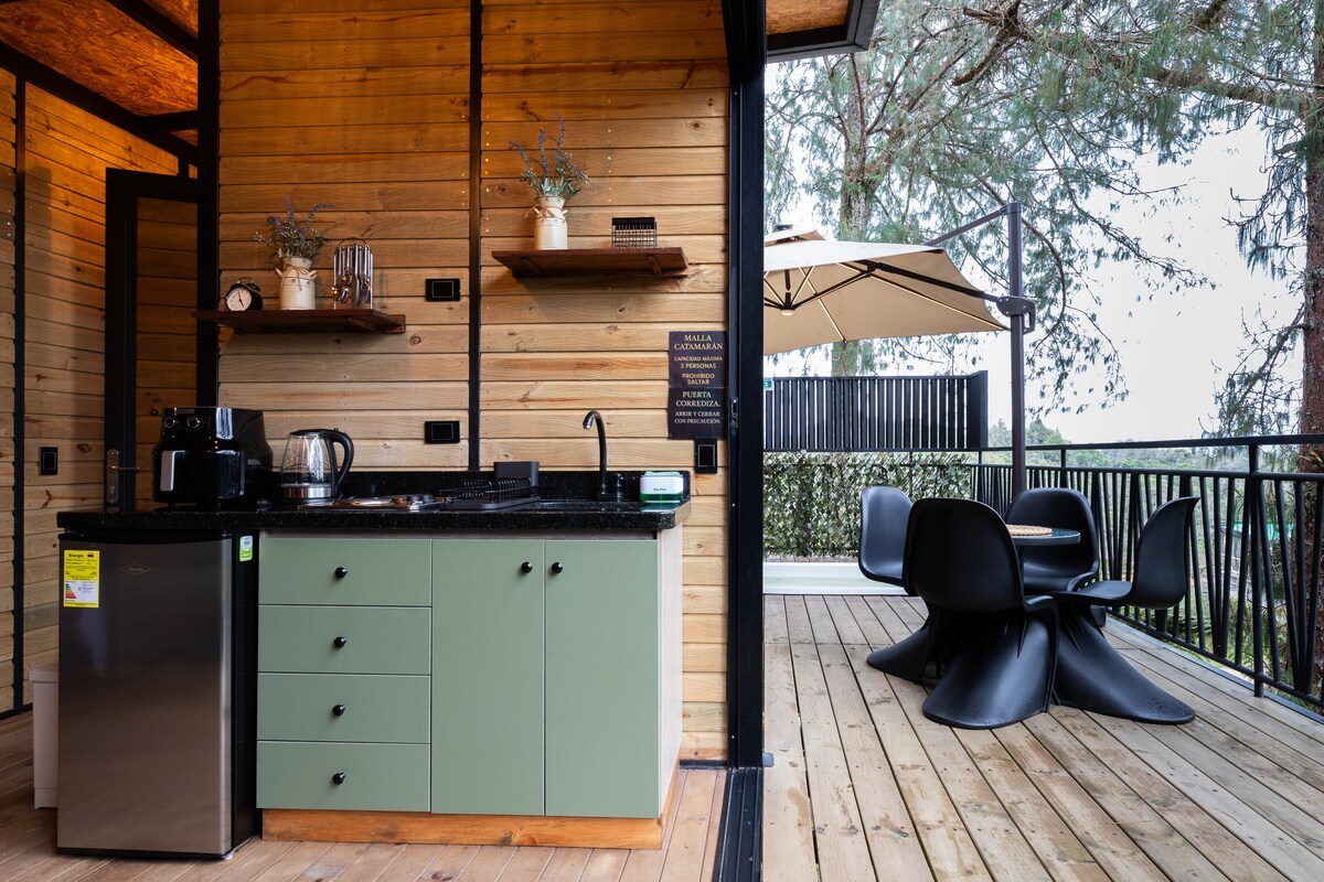 FORESTA is a modern cabin created with love for you to have an unforgettable stay in the middle of nature, with total comfort. Enjoy the privileged views from the deck, chill out in the jacuzzi, watch the dozens of birds that visit us, or have a chat by the fireplace in the living room. FORESTA is a great launchpad to explore Guatape, climb the Rock and do kayaking, jet-skiing, wakeboarding, sailing, paraglading, horseback riding, hiking, helicopter tours or ATV rides. You choose!