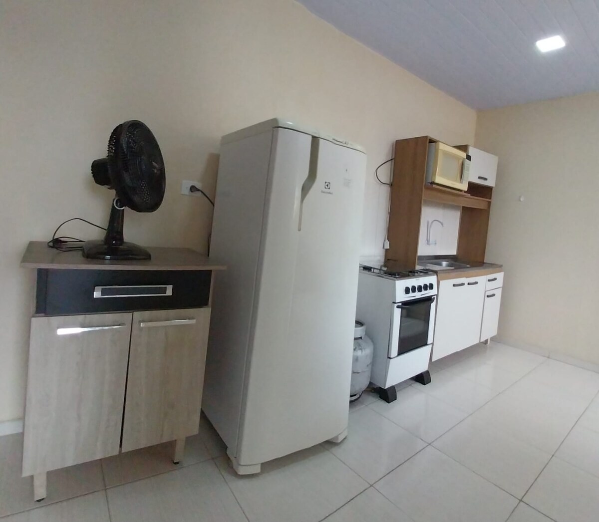 Studio central em Matinhos, perto do mar e lojas. Ideal p/ até 4 pessoas. Tem cama casal, beliche, TV, ventilador e armário. Cozinha equipada, banheiro e lavanderia. Destaque: Chuveirinho externo pós-praia! Garagem: Vaga p/ 1 carro SOMENTE À NOITE (dia na rua, noite no pátio). Localização perfeita p/ fazer tudo a pé. Prático e acolhedor!