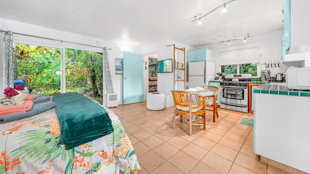 Aloha! The Hana Harvest Cottage is the perfect place to unwind and explore the beauty of Hāna and the surrounding area. Fully renovated and re-furnished including new modern appliances, new organic cotton mattress, WiFi, and upscale modern tropical decor you will feel pampered while nestled in nature. Perched at the level of the treetops, the birds-eye view of the surrounding trees and flowers can be seen from every window and especially enjoyed from the large lanai with beautiful ocean views.