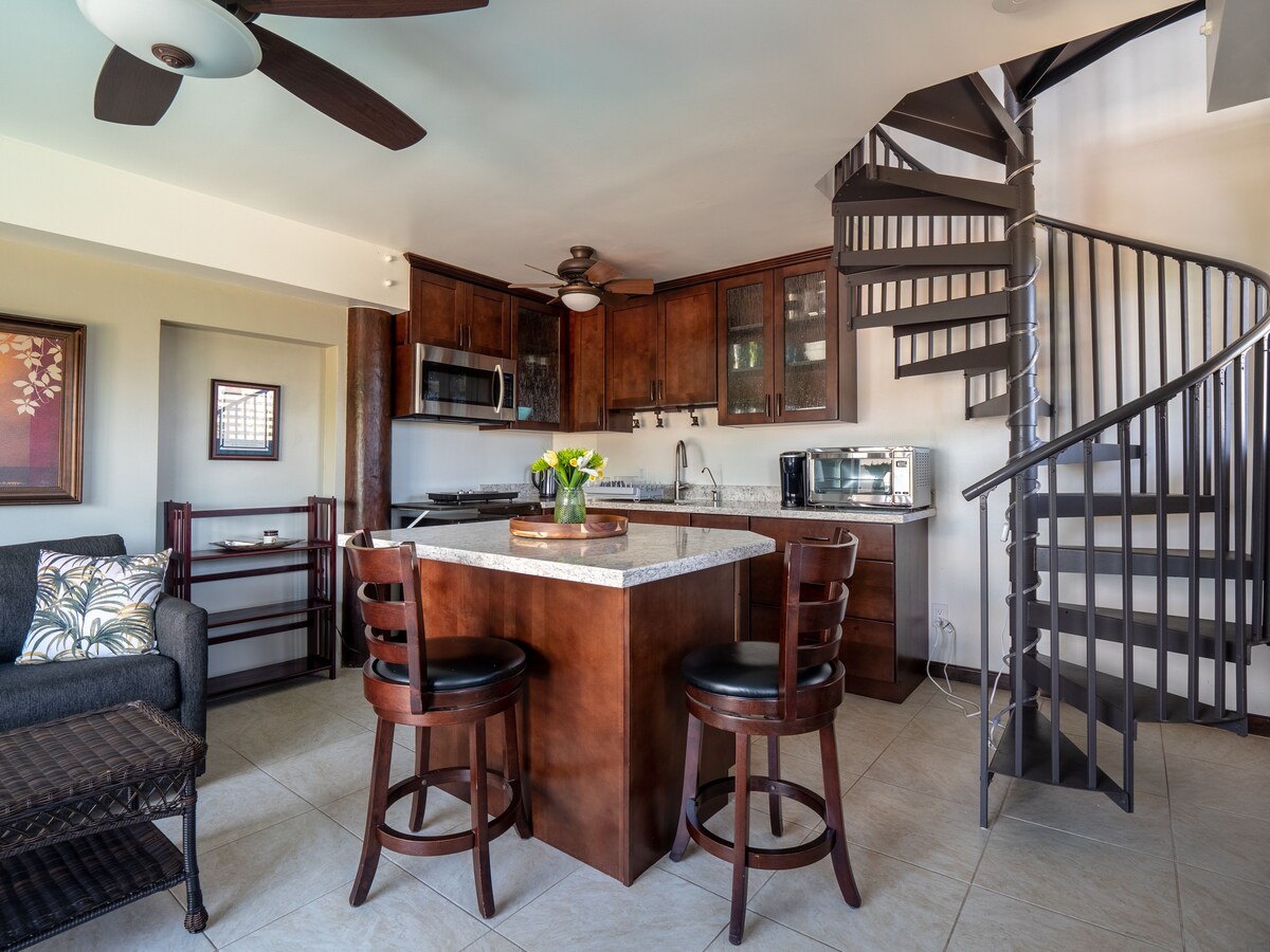 Enjoy a peaceful retreat when you stay at this charming, unique space. Private entrance, expansive ocean views and salt water pool. On the first floor the living room couch opens to a twin size bed and a kitchenette with most amenities. A spiral staircase leads to a second floor with a queen size bed and private bath. Both floors have private lanais. We strive for chemical free organic living spaces. South Maui location five minutes to premium beaches and restaurants.
