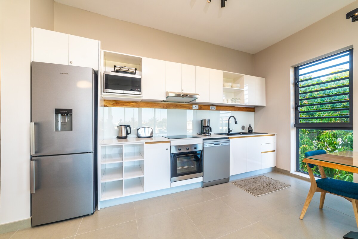 Nestled in the northwest coast of Mauritius, the modern studio apartments at Trou-aux-Biches offer a serene escape with their pool-facing balconies. Imagine starting your day with the gentle sea breeze and the soothing sound of waves, all from the comfort of your own private space. The secure gardens and the panoramic sea views from the roof terrace add to the charm of this idyllic retreat, making it a perfect blend of comfort and natural beauty whether it's a morning swim or an evening stroll