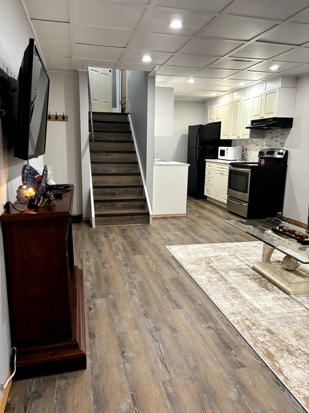 Escape to your own private oasis in this luxurious walkout bungalow. Unwind in the backyard, complete with a hot tub (Weather Dependent). Also, dedicated workspace awaits you, stay active-spin bike, treadmill and free weights. Enjoy your own private entrance with a keypad deadbolt, and a locked door separating the upstairs/downstairs. The efficient kitchen is perfect for a quick meal with small appliances. 2 Guest Maximum, the unit is not suitable for children, no children are allowed to stay.